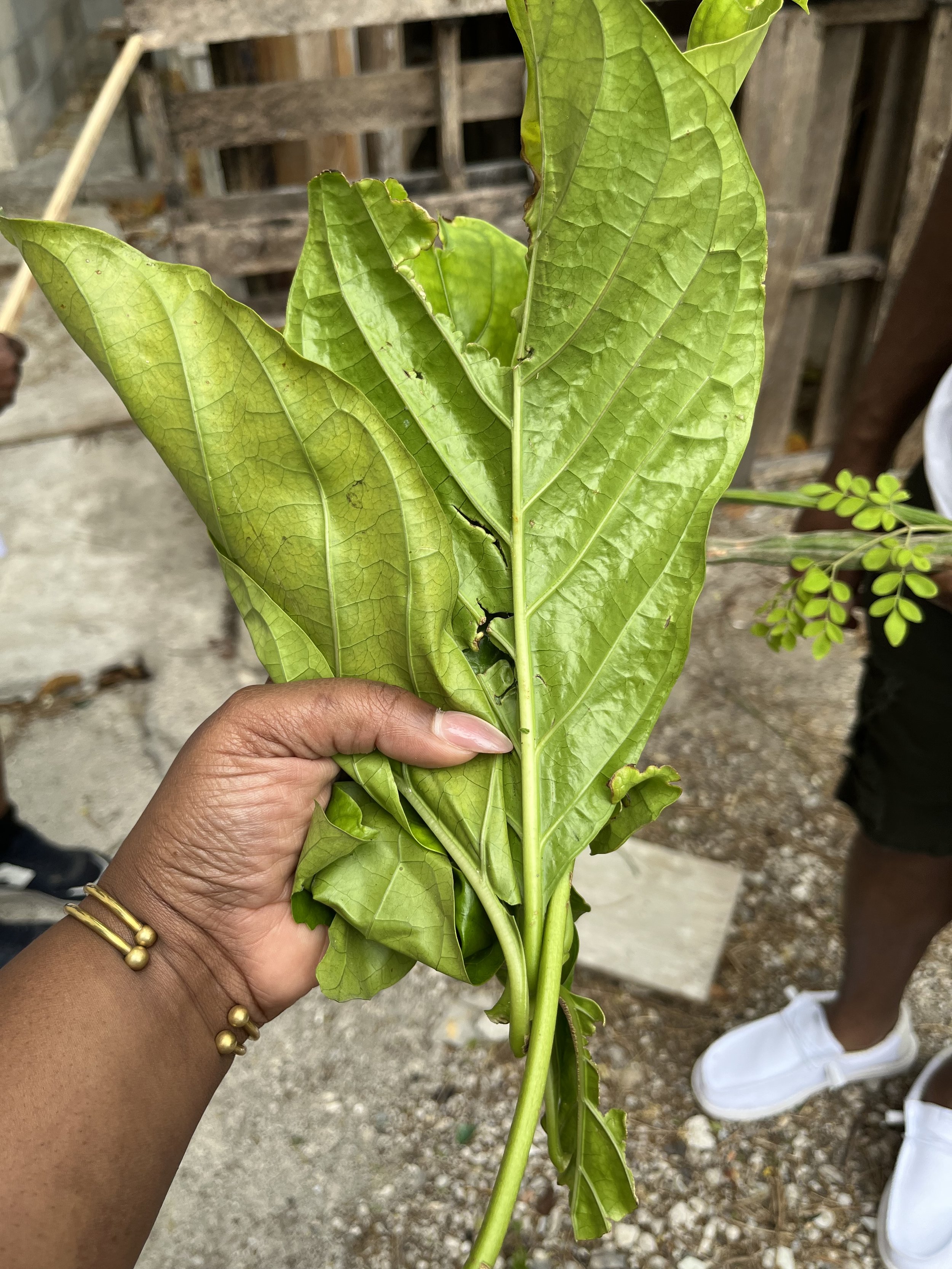 The hands of Annita Francis giving Shamika Miller, moringa from her garden in the Bahamas